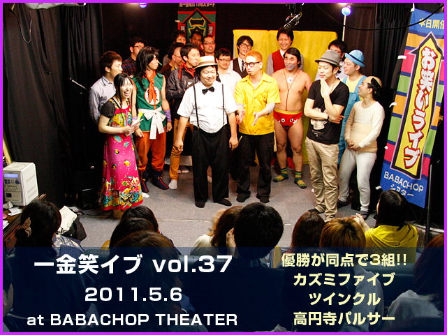 いよいよ、一金笑イブも最終回です いつも通り、いつも以上に! みんなで盛り上がれたらと思います 是非遊びにいらしてくださいね ●最終回!一金笑イブvol.38 6月3日(金)18:40オープン / 19:00 スタート BABACHOPシアターにて ☆入場料1000円(ワンドリンク付き) ケータイサイト★http://babachop.net/walive.html PCサイト★http://www.babachop.com/?eid=944276 MC : 南野やじ& ちぇんちぇん ☆出演者☆ ツインクル/高円寺パルサー/カズミファイブ/まん☆だん太郎/メルヘン須長/もっこり貴族/マリッジブル