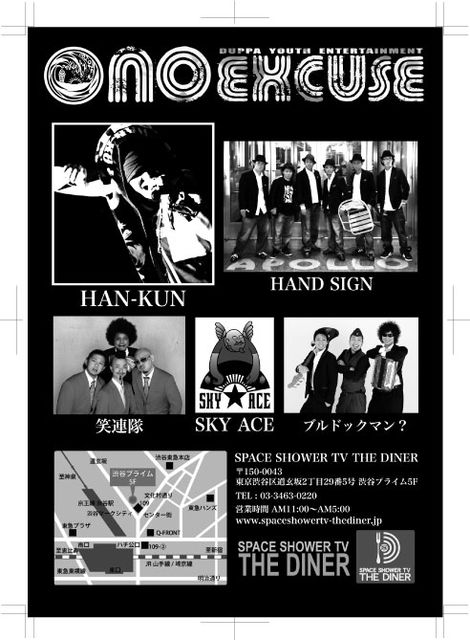 管理人様告知失礼いたします [NO EXCUSE]が次に届ける HAN-KUN SPECIAL LIVE 2011.6月3日 (金) OPEN 18:30 START 19:30 CLOSE 22:00 (未成年入場可能) @THE DINER in 渋谷(日本最大級のMUSICレストラン) 東京都渋谷区道玄坂2-29-5渋谷プライム5F (http://www.spaceshowertv-thediner.jp) <出演者> HAN-KUN fr. 湘南乃風 ブルドックマン? (COMIC BAND) HAND SIGN (PERFORMER) SKY ACE (SOUND) 笑連隊 (MC) メール予約、当日券 ¥6.000(1drink、1food、上記のB2[515×728]mmポスター) *前売り券の発売は終了しました。