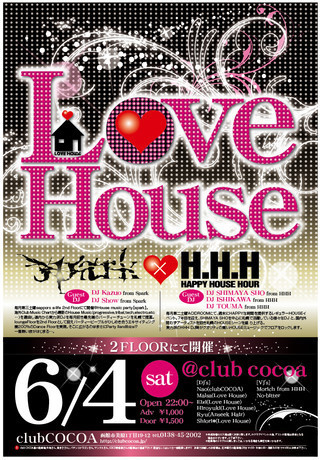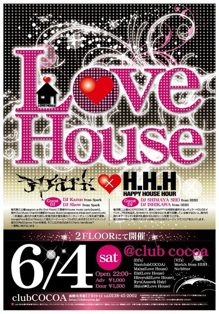 今回のLove Houseは2フロアーにて開催 sapporo a-life 2nd Floorにて最先端のパーティーチューンを提案し続ける House music party【spark】とACID ROOMにて国内外問わずアーティストを招き札 幌のHouseシーンを盛り上げている【HappyHouseHour】のDJ陣を中心にメインフロ アーを盛り上げ、函館から【Love House】DJ勢がPartyを熱くする POPから本格派まで様々なハウスミュージックをお届けします。 Open 22:00~ [Guest Dj] DJ Kazuo from Spark DJ Show from Spark DJ SHIMAYA SHO from HHH DJ ISHIKAWA From HHH [Dj's] Nao(clubC