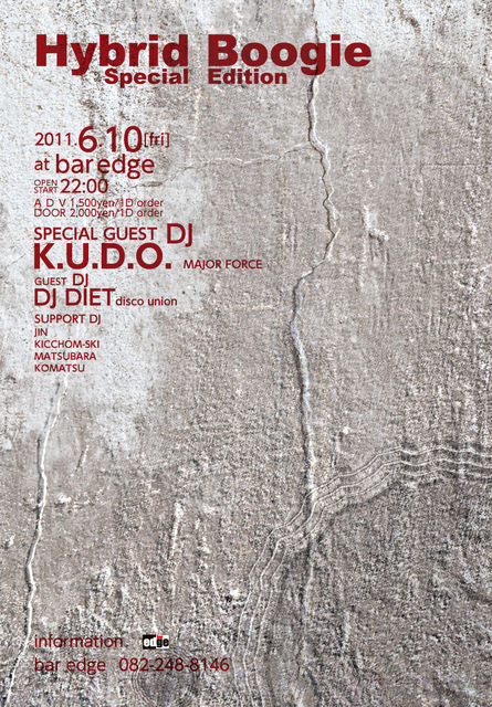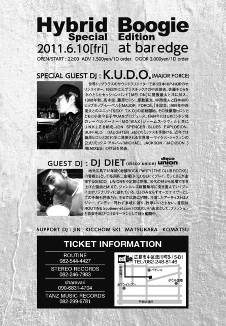 日本初のヒップホップ・レーベル【(MAJOR FORCE】を高木完、藤原ヒロシ、屋敷豪太、中西俊夫と共に立ち上げたあのK.U.D.O.氏が広島bar edgeにやってきます。こんな事は奇跡です。ぜひ、遊びに来てください。