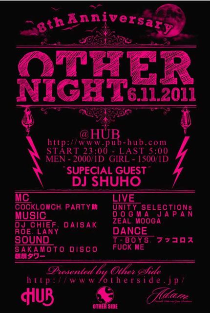 OTHERNIGHTは2003年4月の開催から今年で8周年を向かえる事になりました!長い事、所沢や多くの皆さんに支えられ感謝しています。そこで今回はスペシャルなゲストをお招きし、さらにパワーアップした内容でお送りしたいと思います。まだまだ余震が続き不安な毎日ですが道を開くのも未来に希望を持つのも自分次第。この先も皆で力を合わせていきましょう!! 2009年からお客様の為に始まった「テキーラタイム」!!数量限定でのテキーラサービスなので早い者勝ちです。ガンガン呑んで騒ぎましょう。 MC COCKLOWCH(UNITY SELECTIONS http://www.