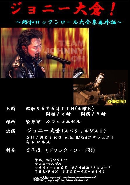 《昭和ロックンロール大全集番外編》ライヴイベント で、で、で、なんと我が『CAROL's』もお呼ばれしていただきましたので、バッチリやりきりたいと思います。 ◇出演者(順): □CAROL's □SHINZIRO with MARIA PROJECT □ジョニー大倉(スペシャルゲスト) と、まるごとご機嫌なライヴステージをお届けしま〜す。 最近のジョニー氏のライヴはボクらが大好きなあの時代のあの曲中心なのでファンにとってはもうタマりません涙モノです § 詳細です。 ↓ ◇日