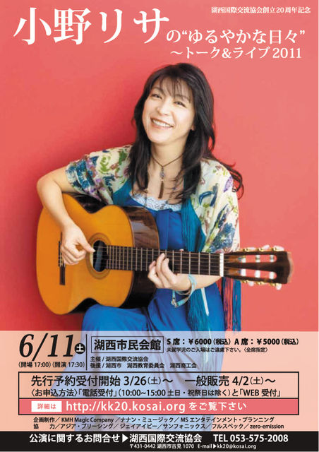 管理人様、イベント告知させていただきます。 全国の小野リサファン、ボサノバファンの皆様にお知らせさせていただきます。 小野リサの”ゆるやかな日々”〜トーク&ライブ2011が 6月11日土曜日 湖西市民会館にて開催されます。 主催は湖西市国際交流協会で湖西国際交流協会創立20周年記念の 一環として主催をさせて頂きます。 S席:\6000(税込) A席:\5000(税込) 全席指定。 未就学児のご入場はご遠慮頂いております。 詳細は http://kk20.kosai.org をご覧下さい。 チケットのご購入も上記サイトよりご購入頂けます。