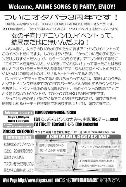 ■■2011年3月12日追記■■ アニソンDJイベント TOKYO OTAKU PARADISE #6 は 明日、3月13日に開催予定だったのですが、 ・11日に発生した地震の影響と、節電が必要な件 を踏まえて、3月13日の開催は延期とする事を決定致しました。 楽しみにしていた皆様は申し訳ありません。 予定では、6月に改めて開催する見込みです。 6月の開催予定に関しては、オタパラWebサイト http://www.otapara.net や、 オタパラmixiコミュ http://mixi.jp/view_community.pl?id=2768648 で、順次告知をしていきますので、どうかよろしくお願いします