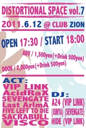 ■2011.06.12(sun)■ "Distortional Space vol.7" @上前津CLUB ZION [act] VIP LINK AcidRaX Last ArlmA FIELD LEFT TO DIE SACRABULL VISCO SEVENGATE [dj] A24(VIP LINK) HIDE(VIP LINK) (JUNYA)(SEVENGATE) open17:30/start18:00 adv\1500/door\2000