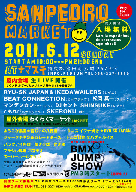 ぴかぴか(新しい)SANPEDRO MARKETぴかぴか(新しい) 2011.06.12(sun) START 10:00--21:00 END AT ナマステ(揖斐郡池田町八幡2579-3) 入場無料手(チョキ) ムード屋内会場 生LIVE開催カラオケ サウンド、レゲエ、ヒップホップ等のLIVEを開催です。 出演アーティスト RYU-SK JAPAN(レゲエ) BEAT CONNECTION(ヒップホップ) MATUOKASINNICHI(フォーク) マンデンカン(アフリカン) DJ セント SHINSUKE(レゲエ) こもれび(ソウル) SKEROKU etc............ ビール屋外会場 わくわくマーケット(18:00終了)レストラン 野菜市場、フリマ、ビール飲食ブース、カメラ写真