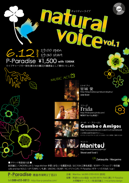 女性ボーカルをフューチャーしたライブイベントです。 「ナチュラル ヴォイス」 open19:00 start19:30 chage\1500 1drink このイベントのチャージ半分を東日本大震災義援金として寄付いたします。 act ・神山の歌姫 「宮城 愛」 http://blog.livedoor.jp/rakuonrakujitsu/archives/386016.html ・京都の歌姫 「Frida」 http://www.myspace.com/tk0617 ・「Gumbo e Amigo」名麺堂Gumbo氏率いるバンド ・「Manitou」http://manitoupeace.jugem.jp/   DJ Zakiaquilla/Margarine 電球チケット取り