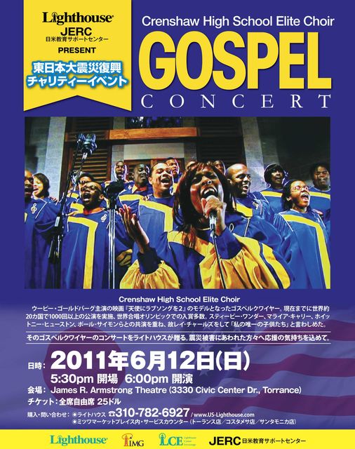 クレンショウ高校エリート・クワイヤー チャリティ・ゴスペルコンサート! 日 時: 2011年6月12日(日) 5:30pm 開場 6:00-6:30pm スペシャル・ゲスト演奏 6:45pm- 主催者挨拶 7:00-8:30pm クレンショウ高校エリート・クワイヤー公演 会 場: James R. Armstrong Theatre 3330 Civic Center Dr. Torrance, CA 90503 チケット: 全席自由席・25ドル 購入・問い合わせ:☎310-782-6927 www.US-Lighthouse.com(ライトハウス・ウェブサイト) *Crenshaw High School Elite Choir ウーピー・ゴールドバーグ主演の映画『天使にラ