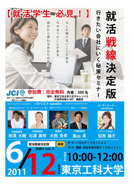 就活戦線決定版 〜行きたい会社に行く秘策セミナー〜 普通の就活セミナーでは絶対に聞けないような経験豊富な著名経営者、 著名団体の代表が明日から役立つ就活情報を伝授いたします。 就活戦線決定版ホームページ http://job-hunting.jimdo.com/ 開催日時:2011年6月12日AM10:00-12:00 参 加 費:無料 参加人数 先着:300名 受付開始:AM 9:30〜 10:00 場 所 :東京工科大学八王子キャンパス 片柳研究棟E-403 講義室 主 催 :(公社)日本青年会議所関東地区東京ブロック協議会 第 一 部:パネルディ