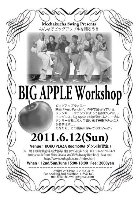ビッグアップルとは… りんご 映画「Keep Punchin’」の中で踊られている、フランキー・マニングによって振付けられたラインダンス。 Big Appleの曲が流れると、一斉にダンサーが輪になって踊り出す光景をみたことがあるはず。。。 あなたも、この機会に学んでみませんか? そして、みんなで6月29日の5th Wednesday Swingin' Nightで踊りましょう♪ http://www.facebook.com/event.php?eid=173816129341934 ---------------------------------------------------- と き:6月12日(日) 15:00-18:00 ところ:KOKO PLAZA ダンススタジオ(