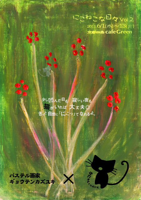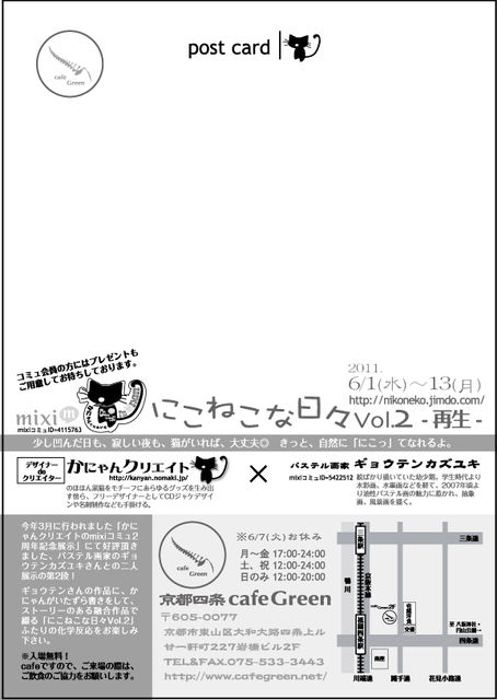 「にこねこな日々」Vol.2 京都展示 テーマ:再生 2011/6/1水-13月 (6/7火休み) 月〜金 17:00〜24:00(L.o 23:30) 土・祝 12:00〜24:00(L.o 23:30) 日のみ 12:00〜20:00(L.o 19:00) @京都四条*cafe Green TEL.075-533-3443 京都府京都市東山区大和大路四条上ル廿一軒町227 岩橋ビル2F(壱銭洋食さん向かい、1F花屋のビル) 京都の京阪祇園四条駅7番出口より徒歩1分の可愛いカフェ 「cafe Green」さんにて開催致します。 料理が美味しくて、マスターも男前で、日曜以外は24時まで営業中! ぜひ、お仕事帰りに