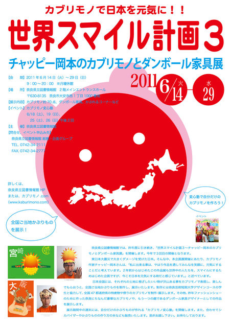 ━━━━━━━━━━━━━━━━━━━━━━━━━━━━━━━━━━━ ● カブリモノで日本を元気に!作品展開催! 6月14日(火)〜29(水) ━━━━━━━━━━━━━━━━━━━━━━━━━━━━━━━━━━━ 奈良県立図書情報館では、昨年度に引き続き、 「世界スマイル計画3〜チャッピー岡本のカブリモノとダンボール家具展」を 開催します。 今年で3回目の開催となります。 ▼ ▼ ▼ http://www.kaburimono.com/wsp2011.html 東日本大震災で大きくダメージを受けた日本。 そんな中、本企画展