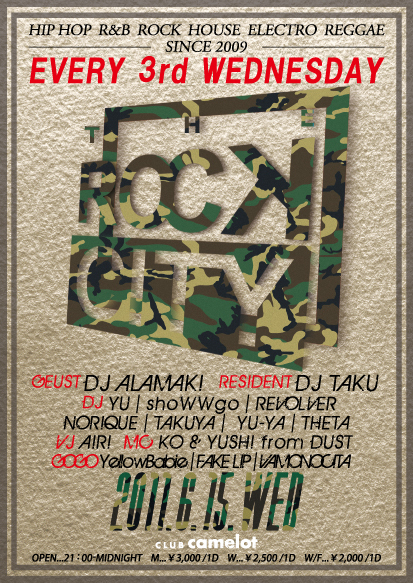 管理人様告知失礼致します。 2011.06.15.WED / THE ROCK CITY@CAMELOTのお得なゲスト用意出来ます! 通常3000円の所を何と1000円に出来ます!! 代表者名と人数を記載の上、気軽にメッセ送って下さい♪ 『THE ROCK CITY』 CAMELOTでは数少ないHIP HOP,R&Bを軸にしたイベントで毎回500人以上入るBIG PARTYです♪ GUEST DJには[BEAT TRIP][SUNDAY DELIGHT]で活躍中のDJ ALAMAKI!! RESIDENT DJには話題騒然のMix CD「FaNY!」も好調なDJ TAKU!! ほか渋谷を主に活動する勢いのある若手DJのみで構成されたPART
