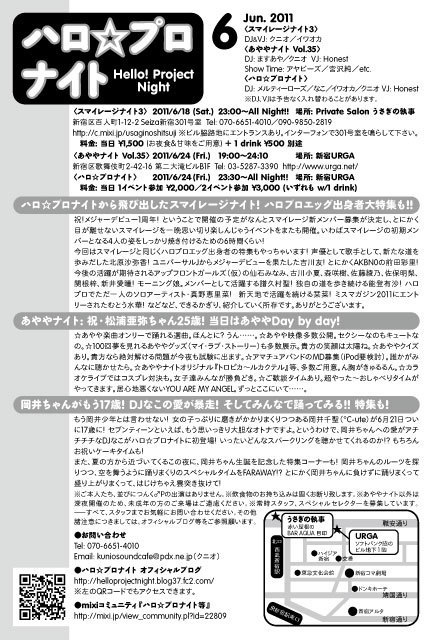 イワオカさん制作によるお知らせ文章を発表! 参加には夜食の都合上、参加表明が好ましいとのシェフの言伝も。 諸々内容は当日のお楽しみで! “スマイレージナイト3” ―ハロプロエッグ2011 TO YOU!― 日時:2011年6月18日(土) 23:00〜All Night! 会場:Private Salon うさぎの執事 http://c.mixi.jp/usaginoshitsuji 住所:東京都新宿区百人町1-12-2 Seiza新宿301号室 070-6651-4010/090-9850-2819 最寄駅: 西武新宿線北口徒歩2分 JR大久保駅南口徒歩3分 JR新宿駅東口徒歩10分 西武新宿線とJR中央線線路に