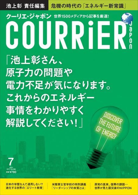 皆様、こんにちは。 クーリエ朝食会@池袋のご案内です。気軽にご参加頂けると幸いです。 今号の特集は「新しいエネルギーの常識」についてです。 原子力問題を発端に、エネルギーをめぐって世界情勢がどうなるのか。 また次世代エネルギーの可能性はどうなのか。 興味深い特集ではありますが、特集だけでなく、政治、経済、ビジネスのこと などなど、何でも気軽に語れたらと思っています。 *************** 内容の紹介です *************