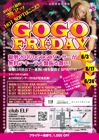 管理人様告知失礼します ■6月17日金曜日、21時〜 渋谷ELF(エルフ)にて GO GO FRIDAY が開催されます! 自分に連絡いただければ 当日料金 男性:3000円/1ドリンク 女性:2500円/1ドリンク のところ ↓↓↓ 【特別ディスカウント価格】 1000円/0ドリンク (男性、女性共に) にてご招待します!! ★☆★☆★☆★☆★☆★☆★☆★☆★☆★☆★☆★☆★☆★☆★☆ ディスカウント希望の方は、 件名に「6/17(金)ゲスト希望」 本文に『代表者のカタカナネームと人数』 私までメッセージを送って