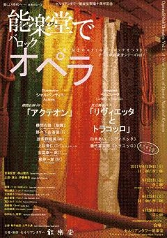 管理人様、こんにちは! 能楽堂でバロックオペラという一風変わった企画の宣伝をさせてください。 ■■■■オペラ@能楽堂Vol.1 シャルパンティエ「アクテオン」/ペルゴレージ「リヴィエッタとトラコッロ」のご案内 ■■ 東京渋谷にありますセルリアンタワー能楽堂でバロックオペラを開催! 能楽師とクラシック音楽家がコラボします。 能楽堂とオペラという異文化を組みあせて新しい文化発信をしていこうとしています。 第一回目は2011年6月に開催。 シャルパンティエの「アクテオン」とペルゴレージの「リヴィエッタ