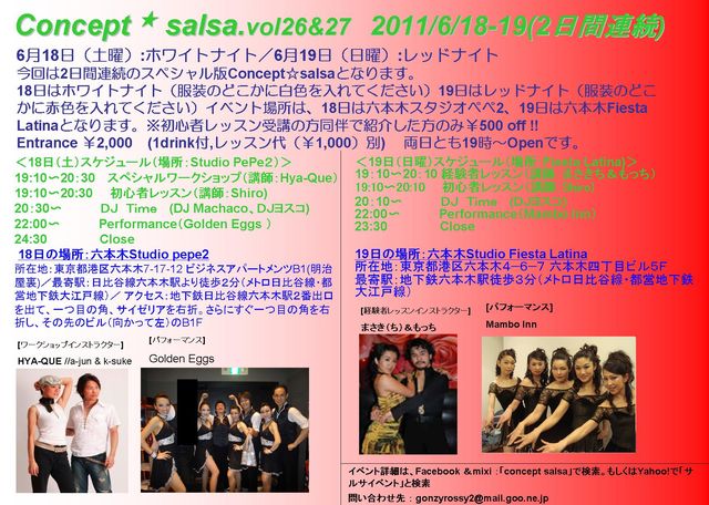 2011/6/18〜19 (土&日曜) Concept☆Salsa Vol.26&27 〜2日間連続イベント〜 場所は2日間とも違います。 (18日はホワイトナイト(PePe2)/19日はレッドナイト(Fiesta Latina)です。) 今回は2日間連続のスペシャルコンセプトウィークとなります。 18日はホワイトナイト(服装のどこかに白色を入れてください) 19日はレッドナイト(服装のどこかに赤色を入れてください) イベント場所は、18日は六本木ぺぺ2、19日は六本木Fiesta Latinaとなります。 ※初心者レッスン受講の方同伴で紹介した方のみ¥500 off !! Entrance ¥2,000 (1