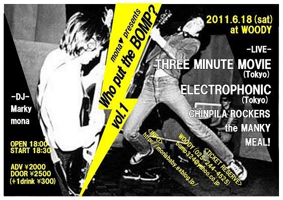 宣伝させてください! いよいよ来週です!! 『Who put the BOMP? vol.1』 2011/6/18 (sat) at 新潟WOODY(http://www16.ocn.ne.jp/~ls-woody/) OPEN 18:00 / START 18:30 TICKET : ADV 2000yen / DOOR 2500yen (+1drink 300yen) -LIVE- ◆THREE MINUTE MOVIE (Tokyo) HP→http://web.mac.com/threeminutemovie/iWeb/Site/Welcome.html MySpace→http://www.myspace.com/threeminutemovie ◆ELECTROPHONIC (Tokyo) HP→http://music.geocities.jp/electrophonictokyo MySpace→http://www.myspa