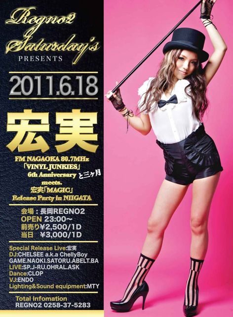 管理人様告知失礼いたします。 REGNO2 SATURDAY'S SPECIAL(通称:レグサタSP☆) FM NAGAOKA 80.7MHz「VINYL JUNKIES」6th Anniversary(と三ヶ月) meets. 宏実「MAGIC」Release Party in NIIGATA 2011/6/18(SAT)@長岡REGNO2 OPEN 23:00〜 前売り\2,500/1D 当日 \3,000/1D Special Release Live:宏実 DJ:CHELSEE a.k.a ChellyBoy.GAME.NAOKI.SATORU.ABELT.BA LIVE:SP.J-RU.OHRAL.ASK Dance:CLOP VJ:ENDO Lighting&Sound equipment:MTY DJ TIMEからLIVE,SHOWCASEまでHIP HOP/R&B好きはもちろんCLUB初心