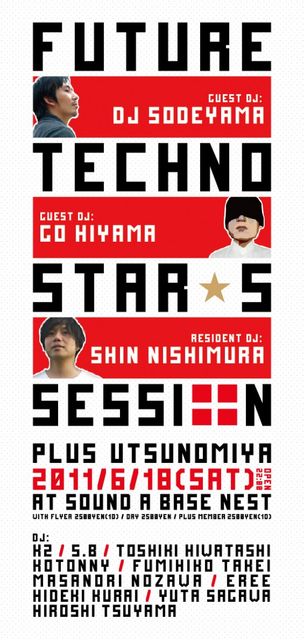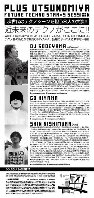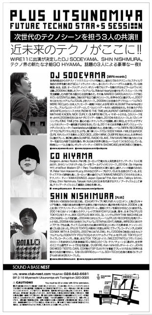 この2年半の間、PLUS UTSUNOMIYA CREWと共にPLUS宇都宮を一緒にやってきたSHIN NISHIMURAが久しぶりに出演!そして、今回のGUESTは次世代TECHNO STAR2人をブック!WIRE11出演決定、 ARPA RECORDS 主宰 DJ SODEYAMA ! 更にヨーロッパで圧倒的な人気の高いアーティスト GO HIYAMA!eRee2時からドラッキーな選曲で挑みます!