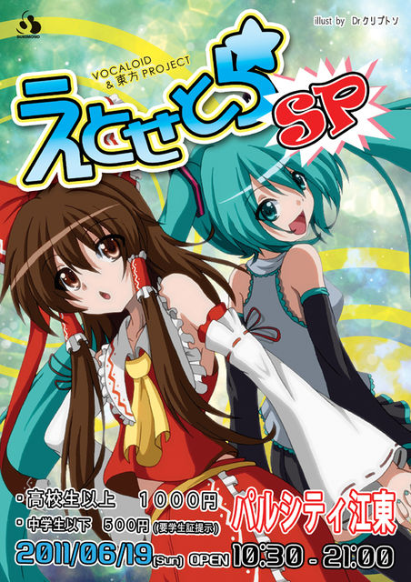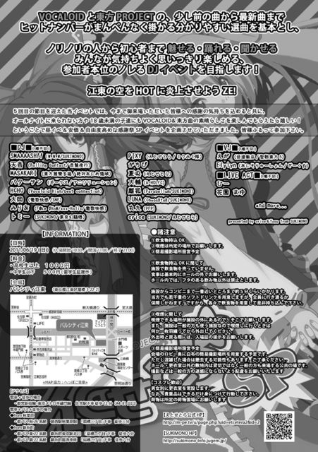 【東方PROJECT&VOCALOID PARTY】 えとせとらVol.6 感謝祭SP@パルシティ江東 VOCALOIDと東方PROJECTの、少し前の曲から最新曲まで ヒットナンバーがまんべんなく掛かる分かりやすい選曲を基本とし、 ノリノリの人から初心者まで 魅せる・踊れる・聞かせる みんなが気持ちよく思いっきり楽しめる、 参加者本位のノレるDJイベントを目指します! 江東の空をHOTに炎上させようZE! 6回目の節目を迎えた当イベントでは、 今まで御来場いただいた皆様への 感謝の気持ちを込めると共に、 オールナイトに来られない方や 18歳