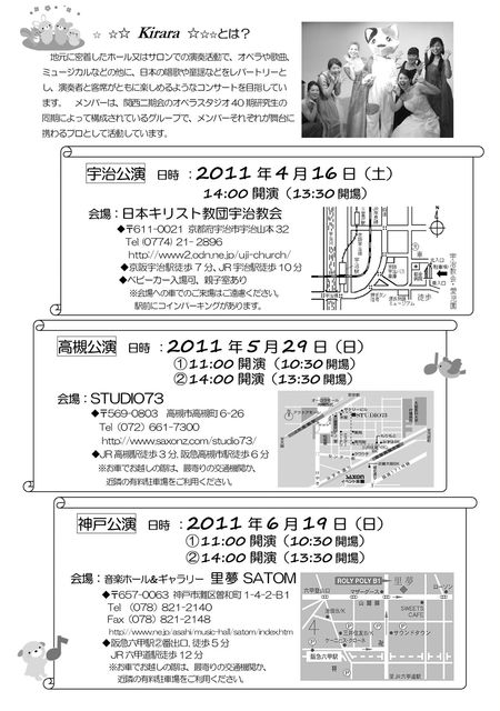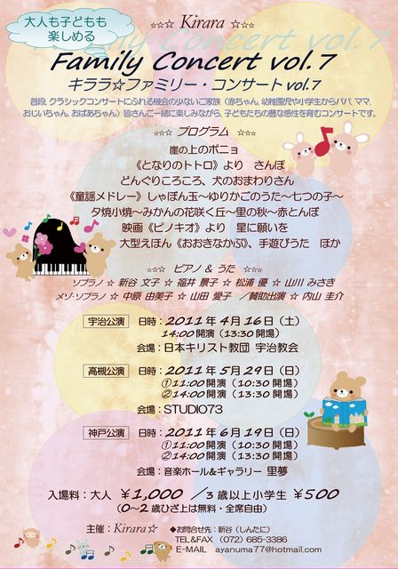 昨年岡本の好文園でファミリーコンサートを開催しましたキララ☆ファミリーコンサートが戻ってきました。 プログラムも昨年から新しい曲が入れ替わり、父の日にご家族で楽しいひと時を過ごして頂けること間違いなし! 会場に定員がありますので、お問い合わせにてご予約をお勧めします。 詳細は下記の通りですので、お気軽にコメント、メッセージをお寄せくださいね。 《キララ☆ファミリーコンサートvol.7》 日時・・・2011年6月19日(日) 午前公演11:00〜12:00 午後公演14:00〜15:00 場所・・・音楽ホ