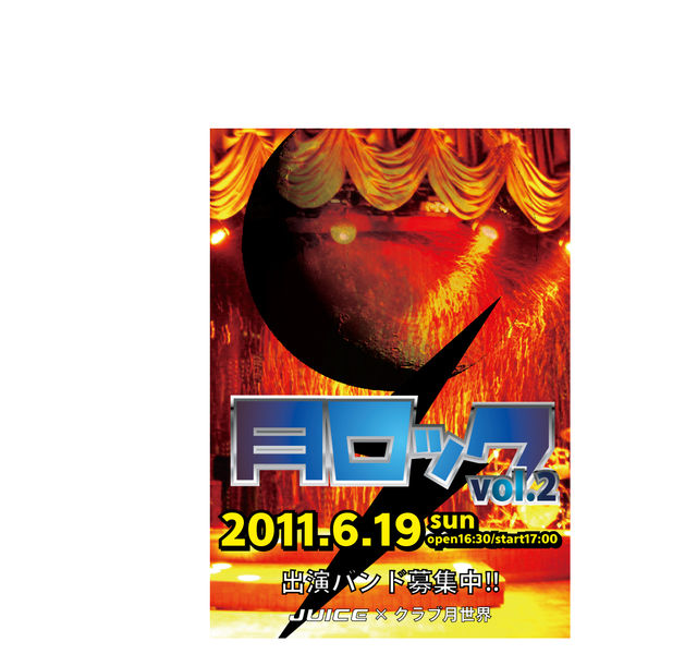 管理人さま 貴重なスペースをお借りして申し訳ありません。 皆さんこんにちは☆ この度ライブハウスの全国情報誌JUICEさんと月世界との前回も応募殺到のライブイベントイベント ”月ロックVol.2”が開催される事になりました。ちょっとかわった元キャバレー、シャンデリアが降り注ぐようなゴージャスな会場での音楽フェスイベントです。 ロックをベースのしたバンド、ロックが好きなバンドさん年齢制限なしの募集で数多くのバンドさん、ソロユニットさんその他もろもろの方のご応募をお待ちしております。 日時 2011.6.19(日