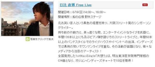 【日比直博 Free Live】 ◆日程:2011年6月19日(日) ◆会場:三井アウトレットパーク マリンピア神戸 ※ステージの場所が変更になっている模様です。 変更後)COACH前野外 変更前)船の広場 野外ステージ ◆時間: START 1ステージ目 14:00〜 2ステージ目 16:00〜 ※観覧フリー ♪日比直博 official blog 2011-05-28 21:32:23 『雨の中〜路上ライブ』より情報引用 ■補足 三井アウトレットパーク マリンピア神戸 〒655-0036 兵庫県神戸市垂水区海岸通12-2 電話:078-709-4466 <交通アクセス>