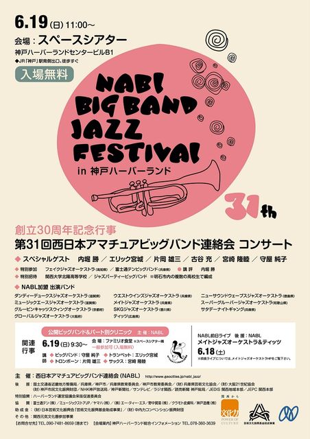 第31回西日本アマチュアビッグバンド連絡会コンサート 〜NABL BIG BAND JAZZFESTIVAL in神戸ハーバーランド〜 日 時:2011年6月19日(日)11:00〜17:45(予定) 場 所:神戸ハーバーランドセンタービルB1 スペースシアター 入場無料