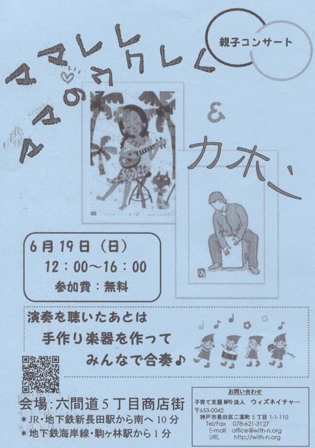 管理人さま、書き込み失礼します。 ママのウクレレとカホンがコラボレーション 演奏を聞いたあとは… 手作りの楽器を使ってみんなで合奏しましょう 日にち:6月19日(日) 時間:12:00〜16:00 参加費:無料 場所:六間道5丁目商店街 お問合せ:子育てNPO法人 ウィズネイチャー 〒653−0042 長田区二葉町5丁目1-1-110 Tel・fax 078-621-3127 E-mail office@with-n.org URL http://with-n.org 是非来てくださいね
