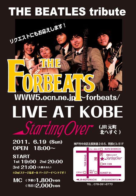 ご無沙汰しております。 フォービーツのたっきーです。 16ゲンさん(名前変えられたんですね)から 「初夏には”しょっか”」と言っていただいておりました 神戸ライブが決定致しました。 当日はポールの69歳の誕生日の翌日! ということで、2ステージ目にポール特集を行います 皆様の奮ってのご参加、お待ちしています! 6/19(日) 神戸三ノ宮 スターティングオーバー http://www.startingover.jp/ 神戸市中央区北長狭通2-8-5阿部ビルB1F Tel:078-391-8770 OPEN 18:00 START 1st 19:00, 2nd 20