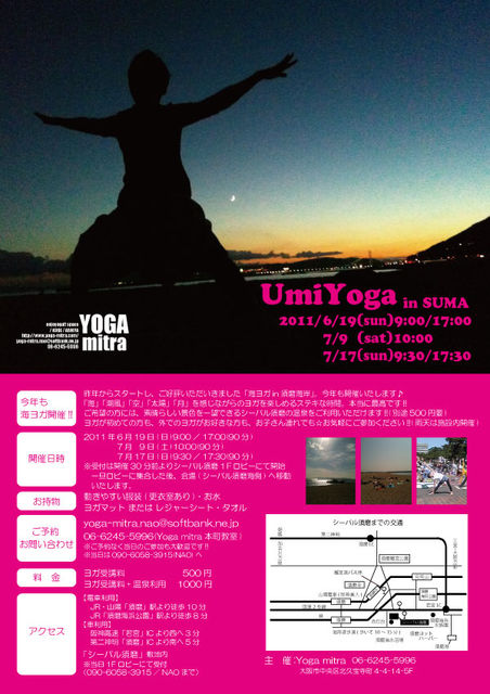 4/29、5/4とたくさんの方にご参加いただきました 「海ヨガin須磨海岸」 6月開催日のご案内です♪ 6月は土曜日にも開催!! 新たなる試みでございます☆ だんだんと気候もよくなり、空と海の青を 楽しめる季節がやってきますよ! 波のリズムをききながら、呼吸のリズムを感じる・・・・ 究極のヨガだなぁと感じます。 【開催日時】 6/4(土)10:00〜(雨天中止)※無事終了いたしました。 6/19(日)9:00〜/17:00〜(雨天時はシーパル須磨内にて開催) ※受付は開始30分前よりシーパル須磨1Fロビーにて開始 【開催場所】 須磨海岸