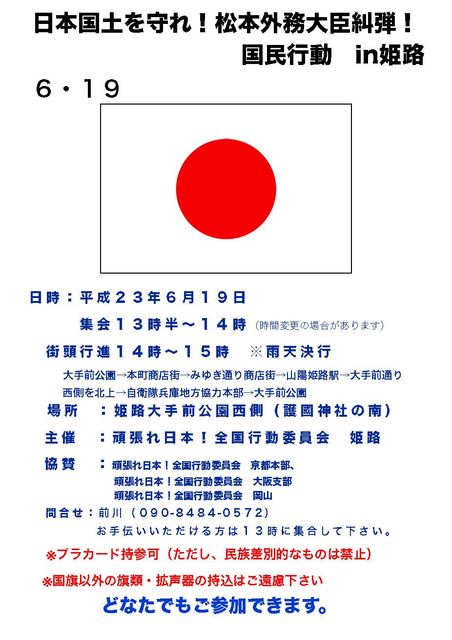 集会とデモのお知らせ。 「日本国土を守れ!松本外務大臣糾弾!国民行動 in姫路」 日時:平成23年6月19日 集会13時半〜14時 街頭行進14時〜15時 ※雨天決行 大手前公園→本町商店街→みゆき通り商店街→山陽姫路駅→大手前通り西側を北上→ 自衛隊兵庫地方協力本部→大手前公園 場所:姫路大手前公園西側(護國神社の南) 主催:頑張れ日本!全国行動委員会 姫路 協賛 : 頑張れ日本!全国行動委員会 京都本部、 頑張れ日本!全国行動委員会 大阪支部 頑張れ日本!全国行