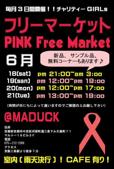 【チャリティーフリマ開催】 是非来て下さい&宣伝お願いします @MADUCK 木屋町(http://www.maduckksc.jp/) 19日(日)12〜19時 20日(月)12〜17時 21日(火)13〜19時 (新品、サンプル品、無料コーナー、メンズ、子供服もっ♪) 室内なんで雨天決行!! Cafeもあります! 是非沢山誘って来て下さい♪ 出店者も募集中です! 勿論引き続き募金活動もさせて頂きます。