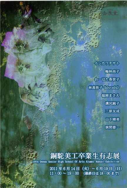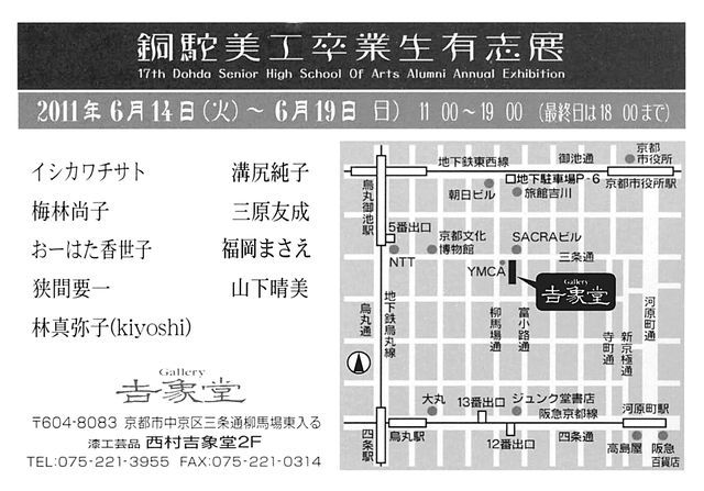 (出展者名は画像をクリックすると大きくなりますので見て下さい) Gallery吉象堂:中京区三条通柳馬場東入ル 漆工芸品「西村吉象堂」2F (お店内、左手の階段を上がって下さい) 11時〜19時まで(最終日は18時まで) 18回目の開催になりました。 銅駝出身者のみならず、広く日吉出身者の出展も過去にありました。 現在も参加者は毎年変動してます。 来年以降の参加者も募集していますので、 会期中ギャラリーに来られた方はお尋ね下さい。 年齢・科は問い