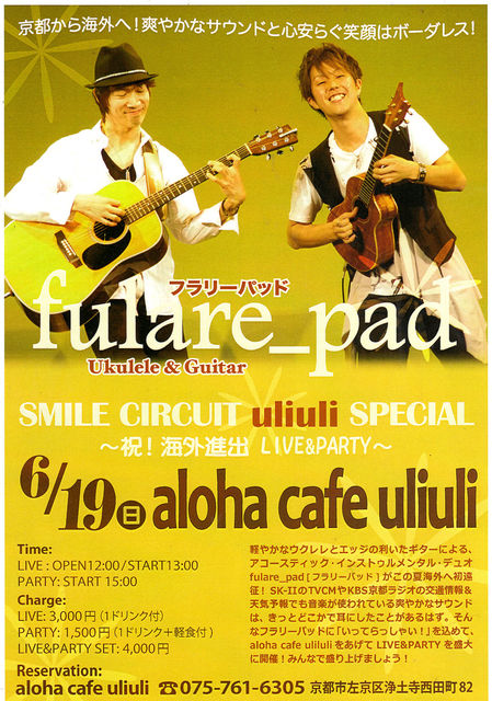 管理人様、告知失礼致します fulare_pad スマイルサーキット UliUli スペシャル 〜 祝!海外進出 Live & Party 日時: 6月19日(日曜日) 時間: 12:00open/13:00start party:15:00start LIVE: fulare_pad http://fulare.com/index.html FEE: ライブチャージ3000円(ドリンク付き) パーティーチャージ1500円(ドリンク&軽食) ライブ&パーティー セットチャー