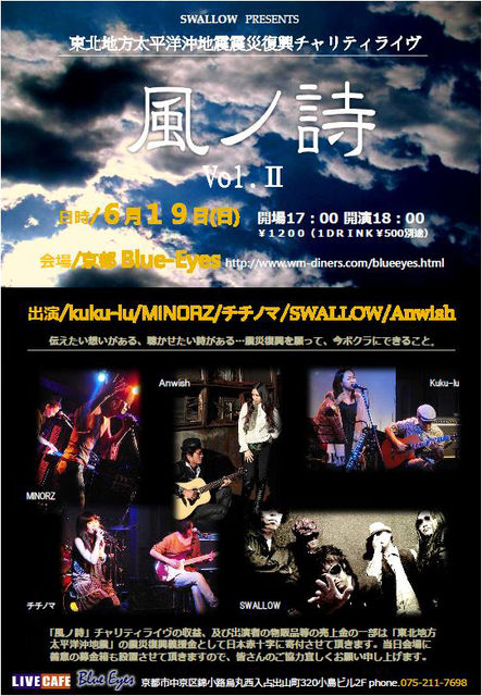 ★6月19日(日) 震災復興支援チャリティライヴ〜風ノ詩vol.II〜 open17:00 start18:00 charge¥1200(1drink¥500別途) 出演:kuku-lu / ミノルズ / チチノマ / SWALLOW / Anwish 伝えたい想いがある、聴かせたい詩がある… 震災復興を願って、今ボクラにできること。 ♪kuku-lu 2009年夏に結成。小心者二人は京都でひっそりアコースティックライブを開始。慣れてきたからもう少し頑張ろうということで、高槻ジャズストリート、新開地音楽祭、FM京都が主催する京都新風館でのフリーライブ等、様々な音楽イベントにも参加。ボサの爽やかなリ