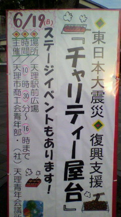 『震災復興支援チャリティー屋台』を開催! 東日本大震災の復興支援の為、このチャリティーを通じ皆様の東日本への支援の心を形にすることを目的とします。 天理駅前広場を会場とし、各種団体のステージ発表、飲食店・その他店舗・団体によるブース出店。 売上の一部を義援金とし、天理市を通じ、被災地へお送りします。 開催日時:平成23年6月19日(日)10時30分〜16時00分 開催場所:天理駅前広場 主 催 天理市商工会青年部・天理青年会議所 参考URL 天理市観光協会 http://kanko-tenri.jp/even