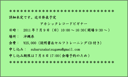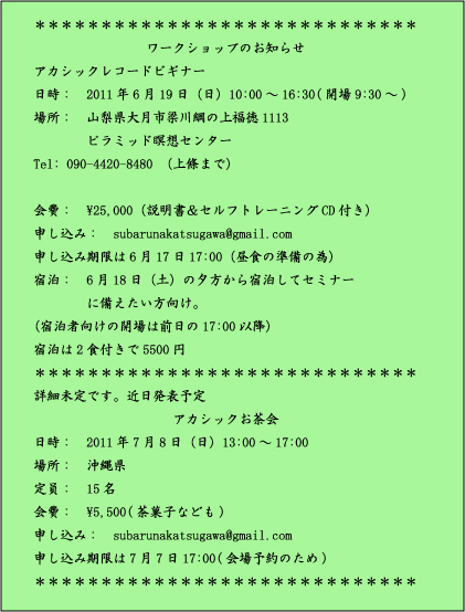 ***************************** ワークショップのお知らせ アカシックレコードビギナー 日時: 2011年6月19日(日)10:00〜16:30(開場9:30〜) 場所: 山梨県大月市梁川綱の上福徳1113 ピラミッド瞑想センター Tel: 090-4420-8480 (上條まで) 会費: \25,000(説明書&セルフトレーニングCD付き) 申し込み: subarunakatsugawa@gmail.com 申し込み期限は6月17日17:00(昼食の準備の為) 宿泊: 6月18日(土)の夕方から宿泊してセミナー に備えたい方