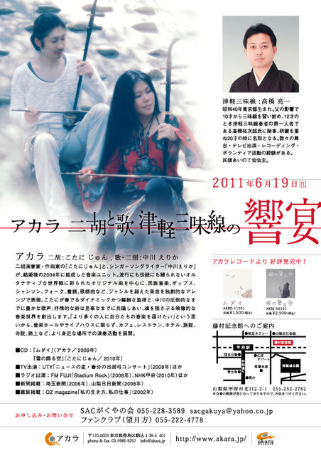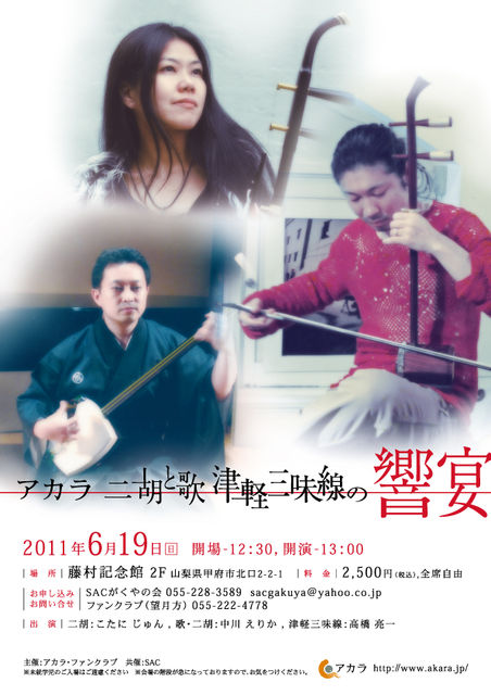 こちらのコミュの場をお借りして、 二胡と歌のユニット「アカラ」の山梨でのライブを告知させていただきます。 今年で6年目になる山梨でのアカラコンサート。 今年第一弾は、新しく甲府駅北口に移設されました藤村記念館にて、 いつもの二胡と歌に加えて、なんと津軽三味線との共演です! 日本の曲、中国の曲、世界の民謡などもお届けする、 聴きこたえたっぷりの演奏会です。 これは本当に聴き逃せないですよー! 〜〜〜〜〜〜〜〜〜〜〜〜〜〜〜〜〜〜 アカラ 二胡と歌 津軽三味線の響宴 2011年6月19日(日) 時間:12:30開場/13:0