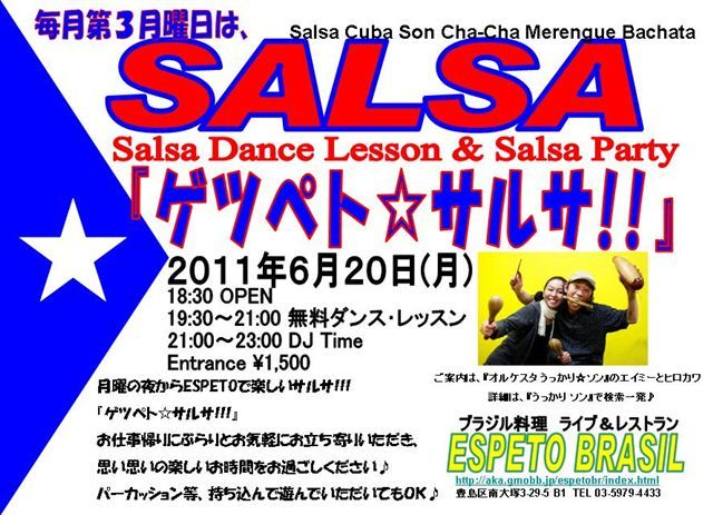 大塚エスペトブラジルさんでゲツぺト☆サルサ!!! すっかり恒例になったこのイベント! 美味しいブラジル料理をいただきながら、 なんとサルサが踊れるようになってしまいます。 サルサは簡単です。 飲みに来たついでに、ご飯食べに来たついでに、サルサを覗いてみてください。 ☆2011年6月20日(月) 18:30〜 OPEN 19:00〜 2時間の無料ダンス・レッスン 21:00〜 DJ Time entrance 1,500yen BEER&FOODS 500yen〜 ご案内:『オルケスタ ukkari ☆ソン』の エイミー&ひろかわ JR大塚駅南口徒歩3分