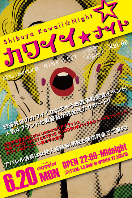 11/06/20(Mon) 【カワイイ☆ナイト】 ◆PLACE:CLUB camelot ◆START:22:00〜Midnight 渋谷発信のカワイクなれちゃうオシャレ新感覚イベント! 人気4ブランドと美容室が完全強力サポート!! ・女性来場者全員にshu uemuraのアイラッシュ ・抽選でNINE WESTとSTEVE MADDENのバッグ&シューズをプレゼント! カワイイ娘、かっこいい男の子大集合! −−−−−−−−−−−−−−−−−−−−−−− ◆DJ ANDO DJ tAisuke(PLUG in LANGUAGE) 五十嵐恭雄 YASUHIKO KETA CARLO SALA ◆GIRLS DJ ORiY ACQUA ◆カワイイ☆