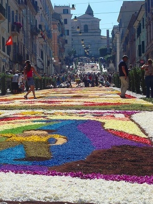 ローマから車で75分の白ワインの産地、ジェンツァーノ村が 世界的に有名なのは毎年6月中旬開催の花祭りインフィオラータです。 中世1778年から続く伝統、ゲーテはイタリア紀行の中で美しさに感嘆したと 書き残してます。 道路一面に敷き詰められた色彩豊かな絨毯の様な花びらのモザイク画は 世界からの旅行者を魅了します。 ローマより専用車で送迎します。