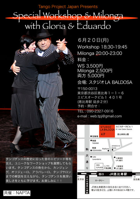 みなさんこんにちは。 いよいよタンゴダンス選手権アジア大会も近づいてまいりました。 多くの方がタンゴダンスにより集中してきている時期かと思います。 今回アジア選手権に審査員として来日するGloria&EduardoによるWSを企画いたしました。 今回は歴史ある活動をされている彼らに、タンゴダンスの歴史に沿った 昔のエピソード等を交え、ユニークなワークショップを展開してもらいます。 タンゴダンスの発生から、カンジェンゲ、オリジェーロ、アラバレーロ タンゴサロンまでの解説を交えながら、タンゴダンスを奥深い楽しさを ともに