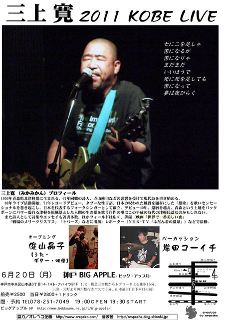 今年、三上寛の半年ぶりのビッグアップルライブです。 三上寛詩学校の精鋭、最近ライブ活動も再動。意欲漲る、アーティスト俊山晶子をオープニングに迎え、 そして不肖、岸田コーイチも久々の演奏、パーカッションで師匠・三上寛の世界に色をつけていきます。 是非みなさん是非お越し下さい。 6月20日(月)神 戸 BIG APPLE-ビッグ・アップル- 神戸市中央区山本通3丁目14-14ト-アハイツB1F (JR・阪急三宮駅からトアロード上る徒歩15分。三宮・元町より神戸駅行きバスで5分、山本通3丁目下車目の前) 前売¥2500 当日¥2800+1
