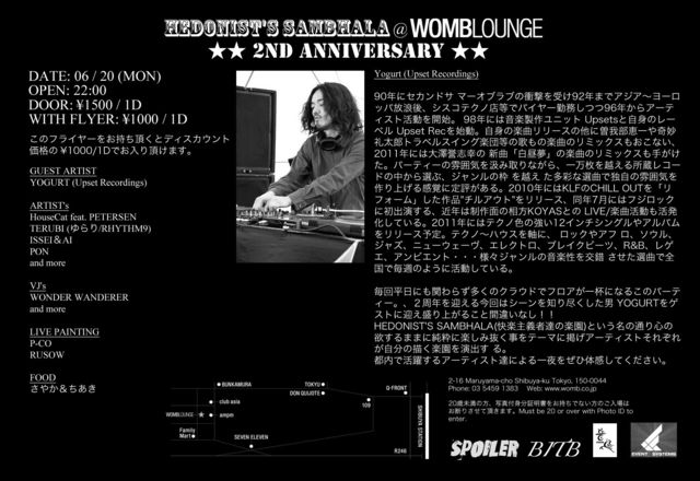 管理人様告知失礼します。 6/20今度の月曜日にコアなクラバーから初めてクラブに来る人まで気が付けばみんなで飲んで踊って楽しんでるパーティーHEDONIST'S SAMBHALAがみなさまに支えられて二周年を迎えます。今回はゲストにパーティーを知り尽くした男、Mr.PARTY DJ YOGURTを迎えさらにヤバイこと間違いなし!! 平日とは思えない雰囲気をぜひ味わいに来てください。 直接メッセージいただきますかこの画面を当日エントランスで提示して頂ければディスカウント(1000yen/1Drink)で入場いただけます。 ぜひ遊びに来てください。 6/20(MON) HEDO