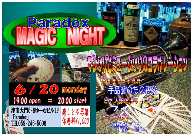 2011年6月のマジックナイトは月曜日の20日です。 あっと思っている間にもう〜6月、激動の6ヶ月でした 梅雨入りもいつもより2週間も早く入りました。 梅雨でじめじめ。政権にいらいら、パットいきましょう 今年後半の過ごし方のヒントが見つかるかも・・・?? マジックナイトは続きます。来ていただいた方々に元気を与え、 又、復興の為の多少なりとも助けになればと考えております。 是非お待ち致しております。 老若男女幸せを演出致します。 日時:6月20日(月)20:00スタート 場所:パラドックス 津市大門6−9ゆーむビル