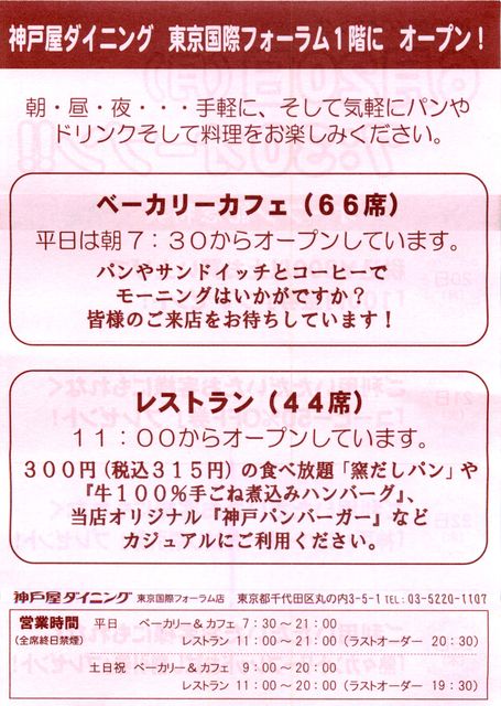 銀座breakfast倶楽部 vol.274を開催いたします。 早起きで爽やかでHappyな朝を感じましょう。 管理人さんがどうしても朝イチで制服が見たいというので、 うわさの?新店舗で早々に開催します。 オープン記念特典 20(月) \300円以上お買い上げで「100円金券」 21(火) 「コーヒー50%OFF券」 22(水) 「神戸パンバーガーお試し割引券」 23(木) 「熱々カントリーブレッドお試し割引券」 というわけで、今週は神戸屋ダイニング祭り!! 「朝を制するものは、人生を制する」 「人はパンのみにて生くる者に非ず」 ぜひご参加ご検討く
