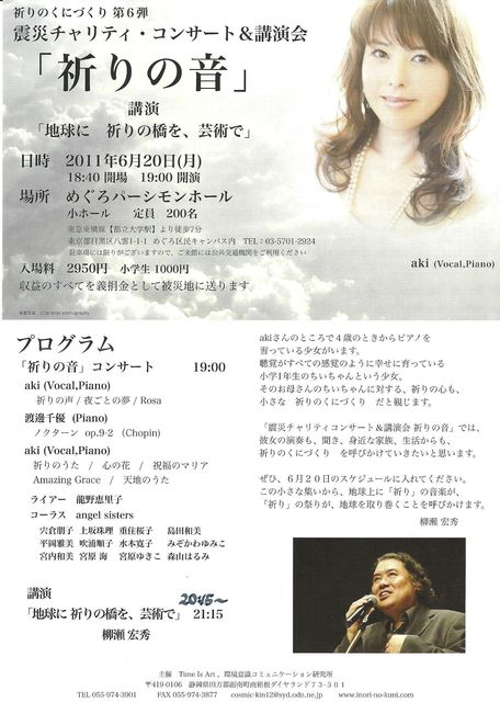 いつも、お世話になっています。 震災チャリティ・コンサート&講演会 「祈り の音」 日時 6月20日(月) 18時40分開場 19時開演 改めてのご案内です。 当日、受付で、予約なしでも、「参加できます」 まだ、7-80名は、参加可能です。 ぜひ、御友人と御一緒にお越しください。 東日本大地震の被災者の皆さんの悲しみと困難に心を合わせ、一日も早い復興を願います。収益はすべて、被災地への義援金とさせていただきます。 今日までの予約で、会場費、照明、音響、ピアノレンタル、調律などの費用はすでに、上回っ